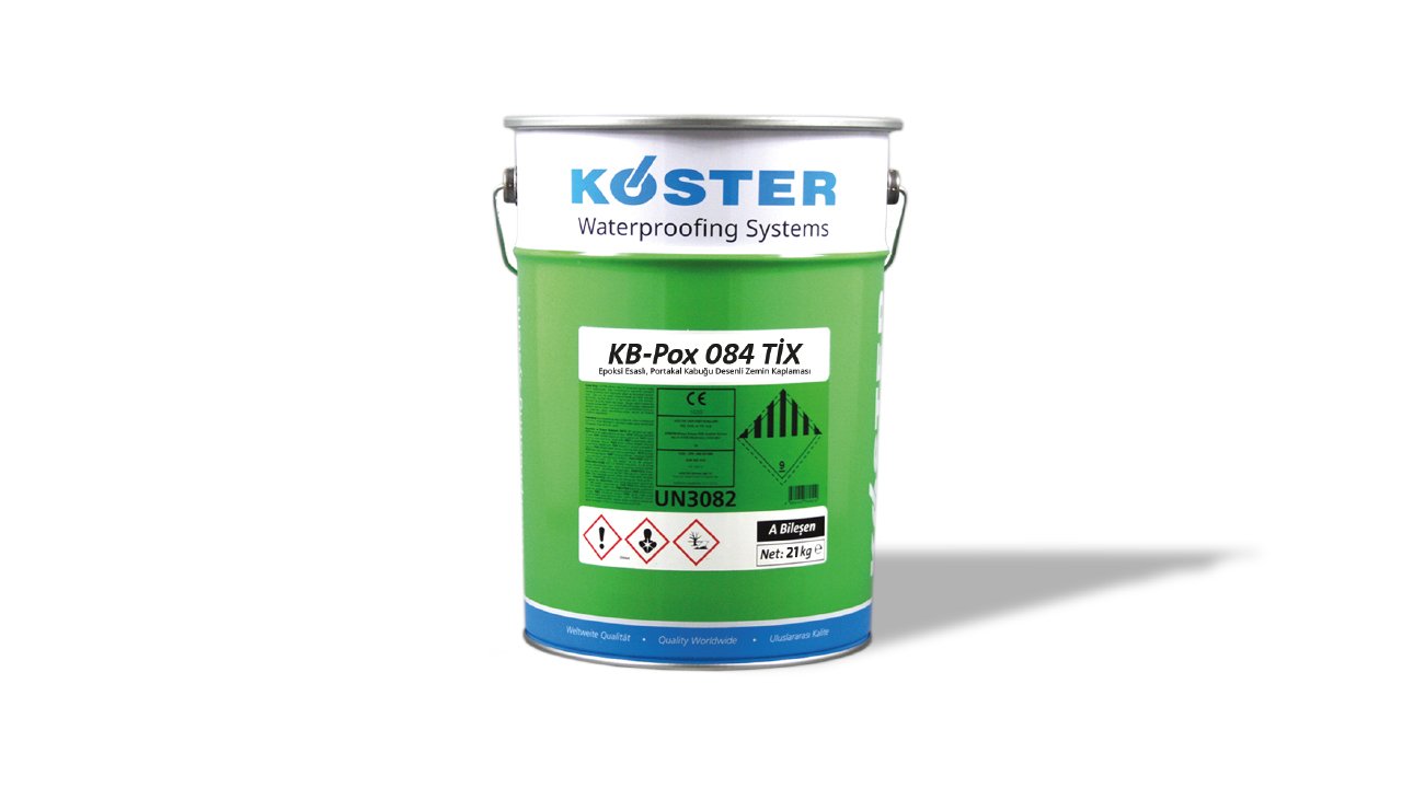 KÖSTER KB-Pox 084 TİX iki bileşenli, renkli ve kaymaz portakal kabuğu desenli epoksi esaslı zemin kaplamasıdır. Özel formülasyonu ve uygulama tekniği sayesinde portakal kabuğunu andıran, hafif pürüzlü fakat kaymazlık özelliği olan ve estetik görünüm sağlayan, zemindeki ufak hataları örten bir zemin kaplaması oluşturur.